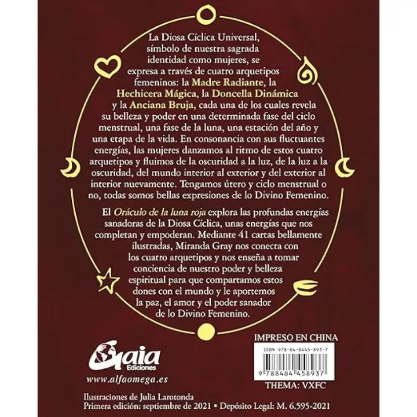 Adéntrate en el misterioso reino de lo sagrado femenino con el «Oráculo de la Luna Roja». Miranda Gray nos sumerge en el poder transformador de la Diosa Cíclica Universal, desvelando sus secretos a través de cuatro cautivadores arquetipos femeninos: la Madre Radiante, la Hechicera Mágica, la Doncella Dinámica y la Anciana Bruja.